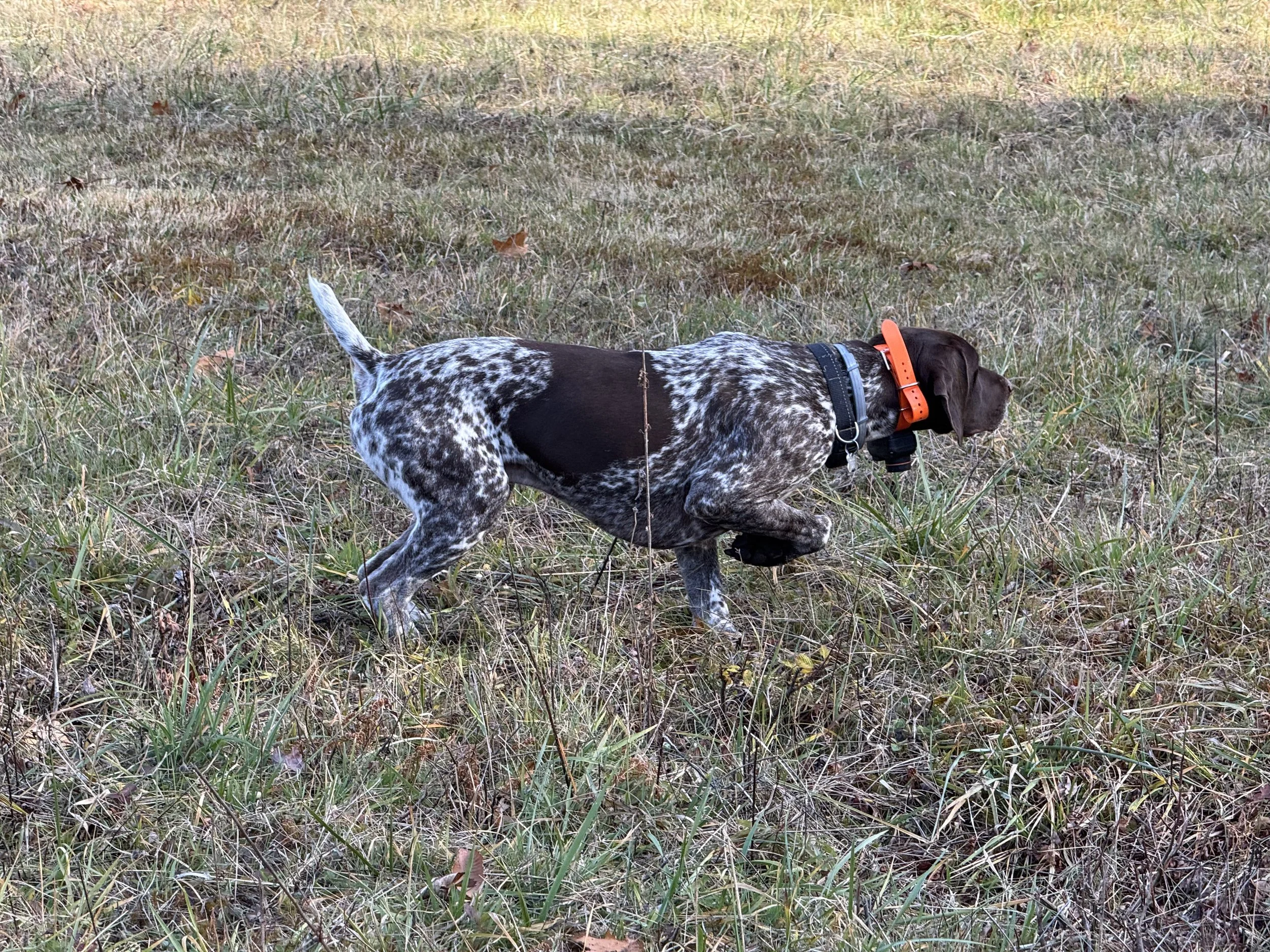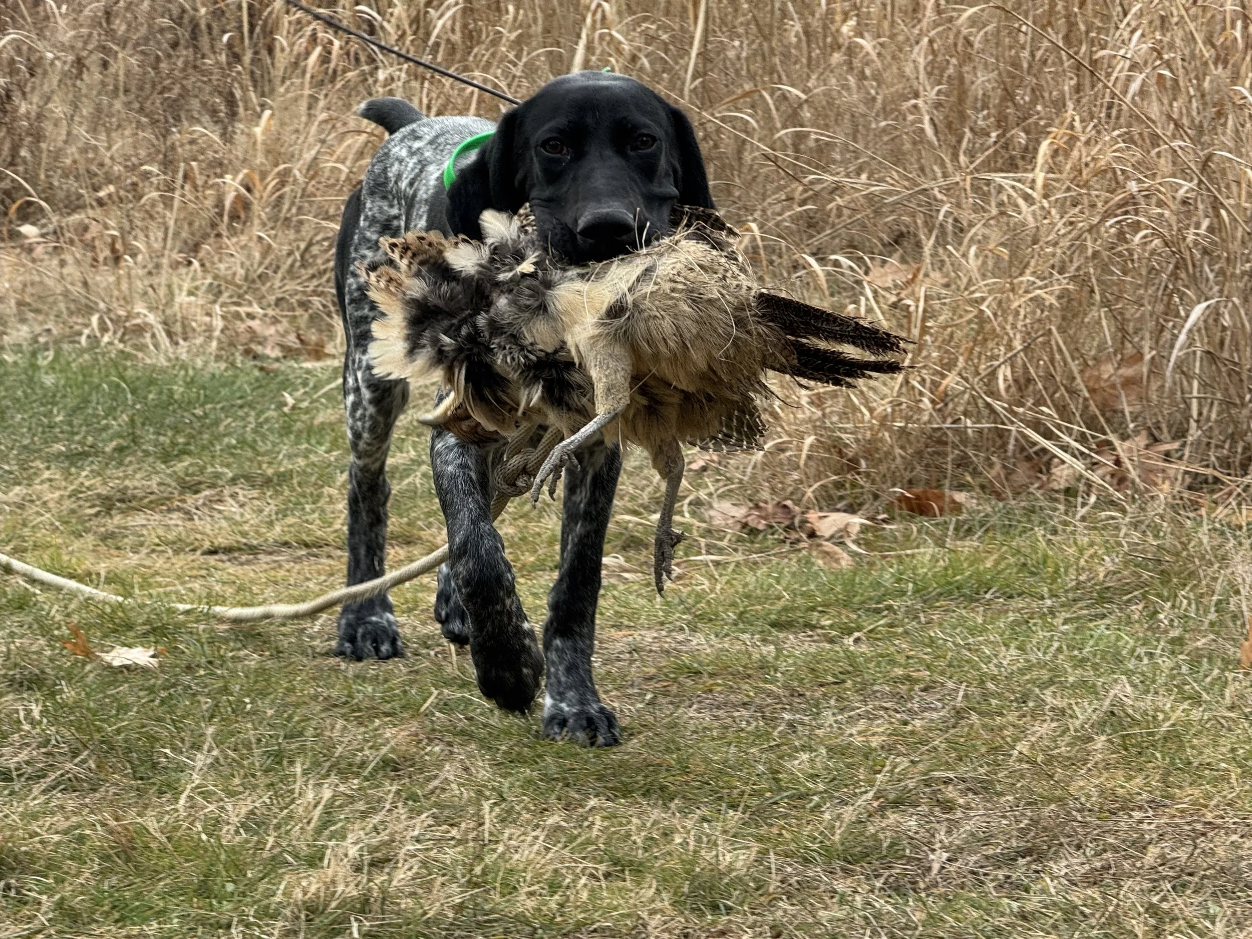 For upland bird dogs we work on developing bird drive, retrieve drive, hunting pattern, intro to tracking, in the field handling and experience working in different types of covers and water. Depending on the age and maturity of pointing dogs we may work on steadiness to flush.